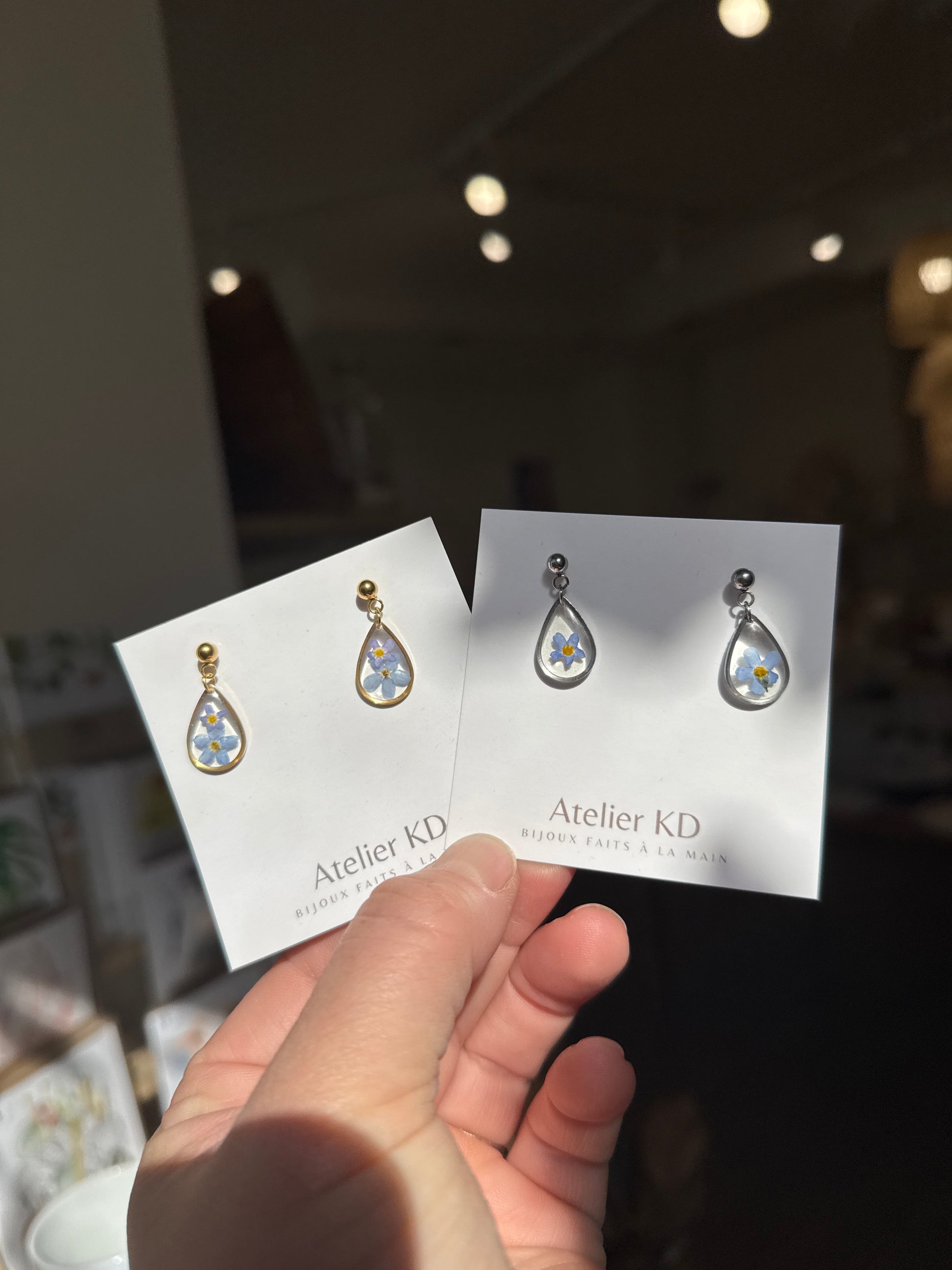 Boucles d’Oreilles en résine incrusté de fleurs de myosotis séchées.