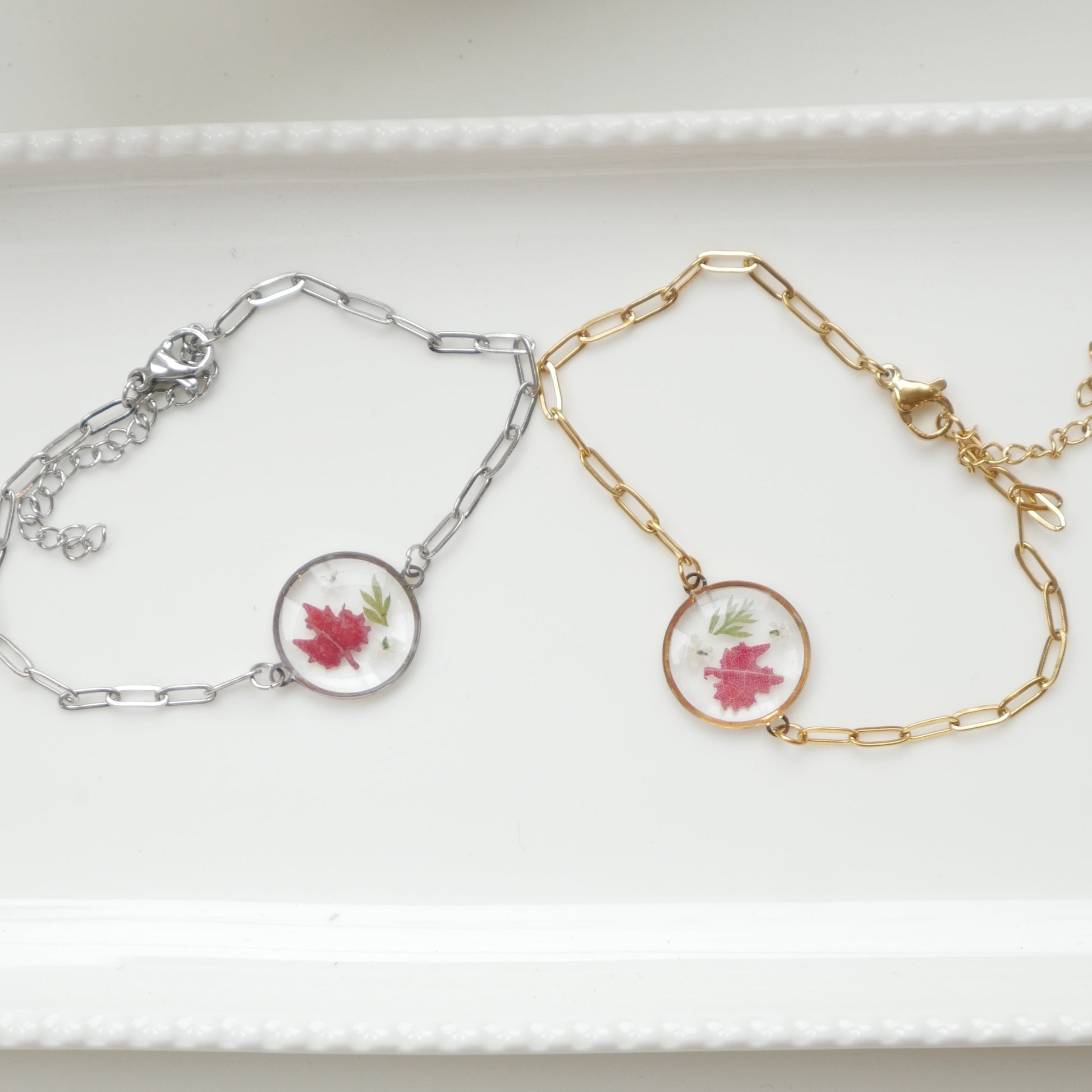 Bracelet en résine incrusté de véritables feuilles d'érables séchées et poinçonnées en forme de feuille d'érable.