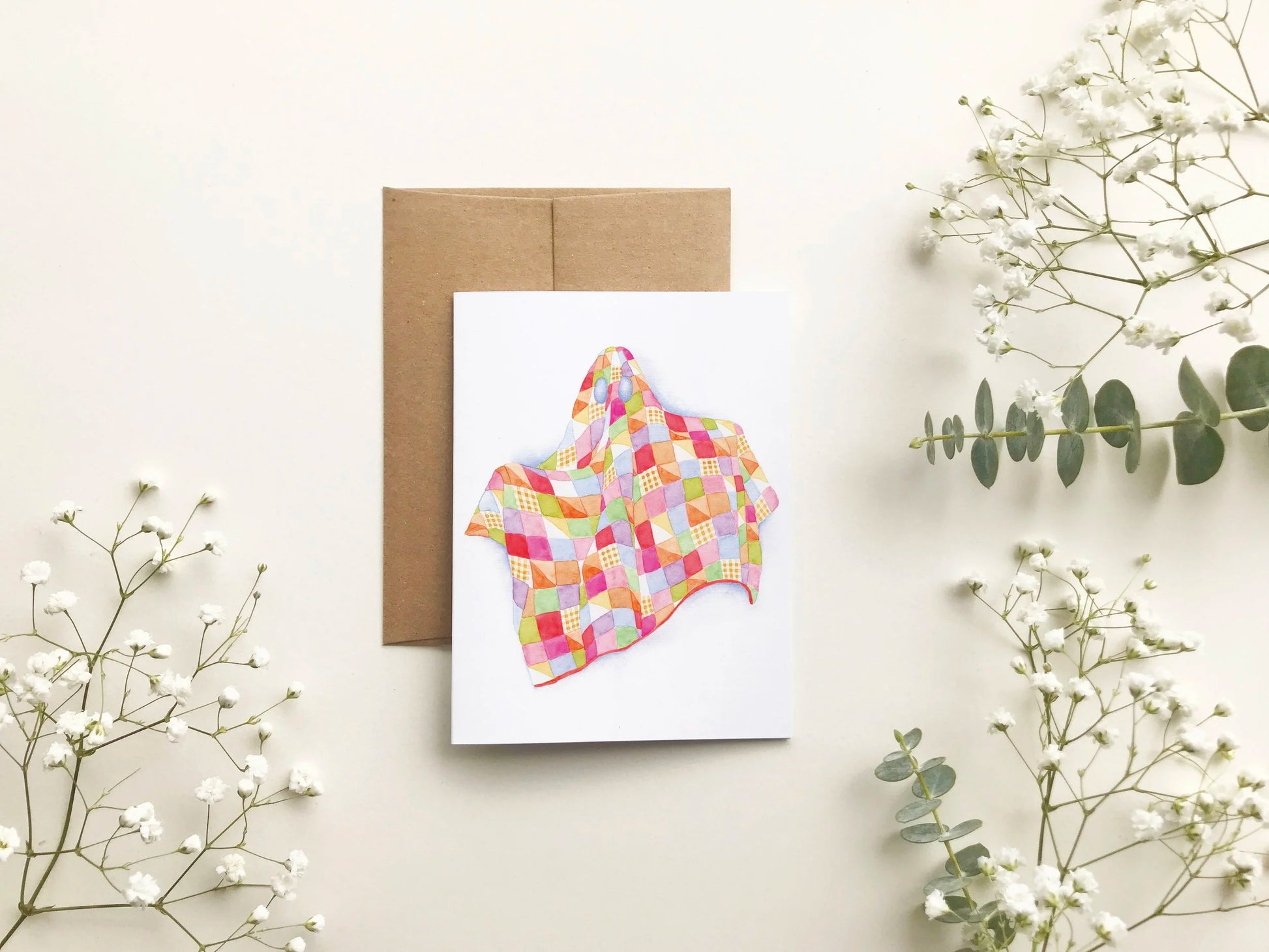 Un petit fantôme dissimulé sous une courtepointe improvisée, drôle et attendrissant. Cette carte de souhait rend hommage aux déguisements faits maison et à l’imaginaire poétique des soirs d’automne.