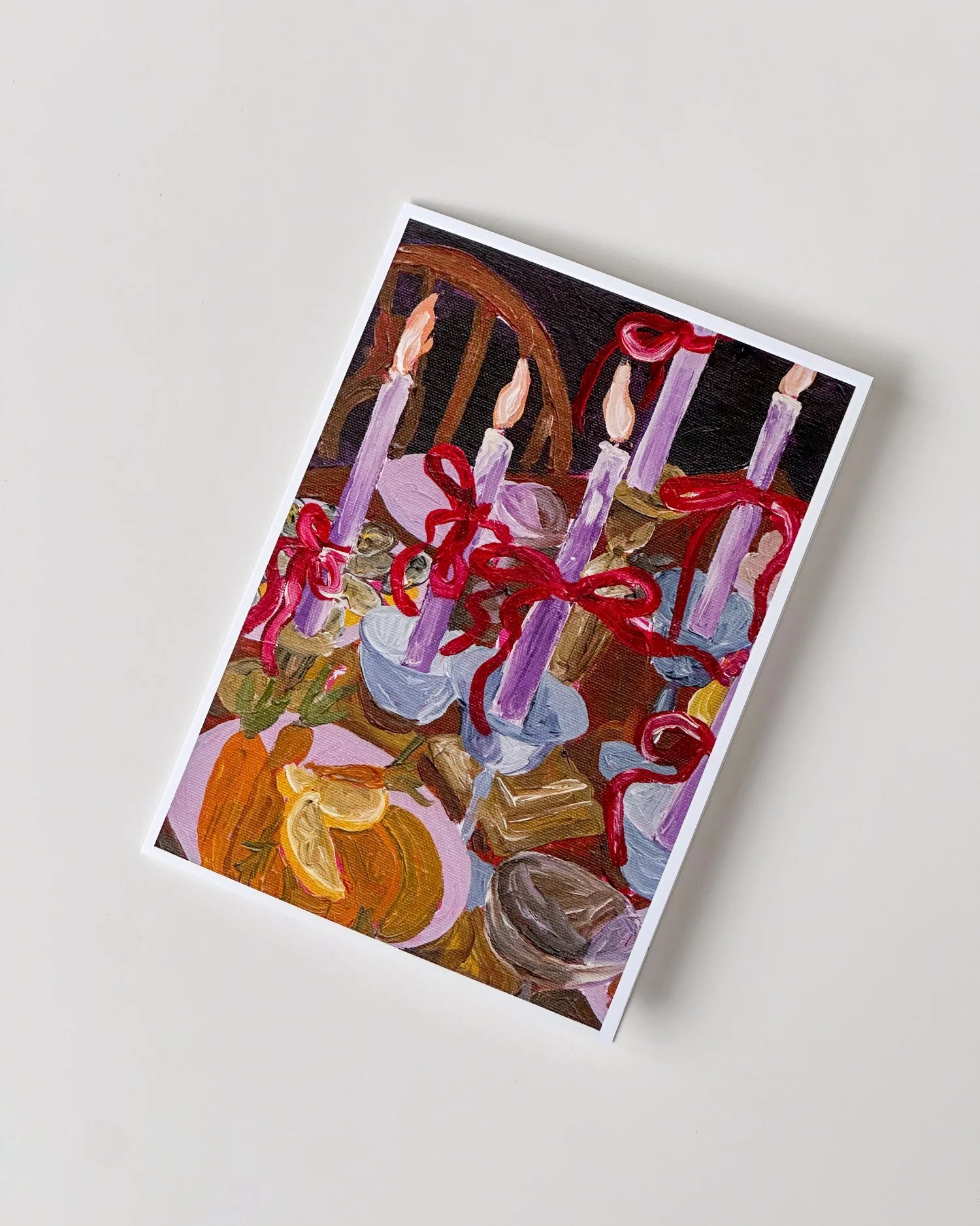 Carte de souhaits avec une reproduction d'une oeuvre de l'artiste visuelle Naomi Poirier sur la couverture. Elle est imprimée sur du papier mat velouté 230gsm (60lb). L'interieur de la carte est vierge et elle vient avec une enveloppe assortie.