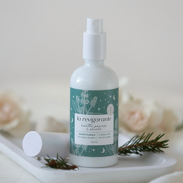 Formulée avec un mélange d’hydrolats de menthe poivrée, lavande, romarin, carotte sauvage, pruche, ciste ladanifère et achillée millefeuille, cette brume tonifie la peau tout en douceur et ajoute une touche d’aromathérapie à votre rituel quotidien.