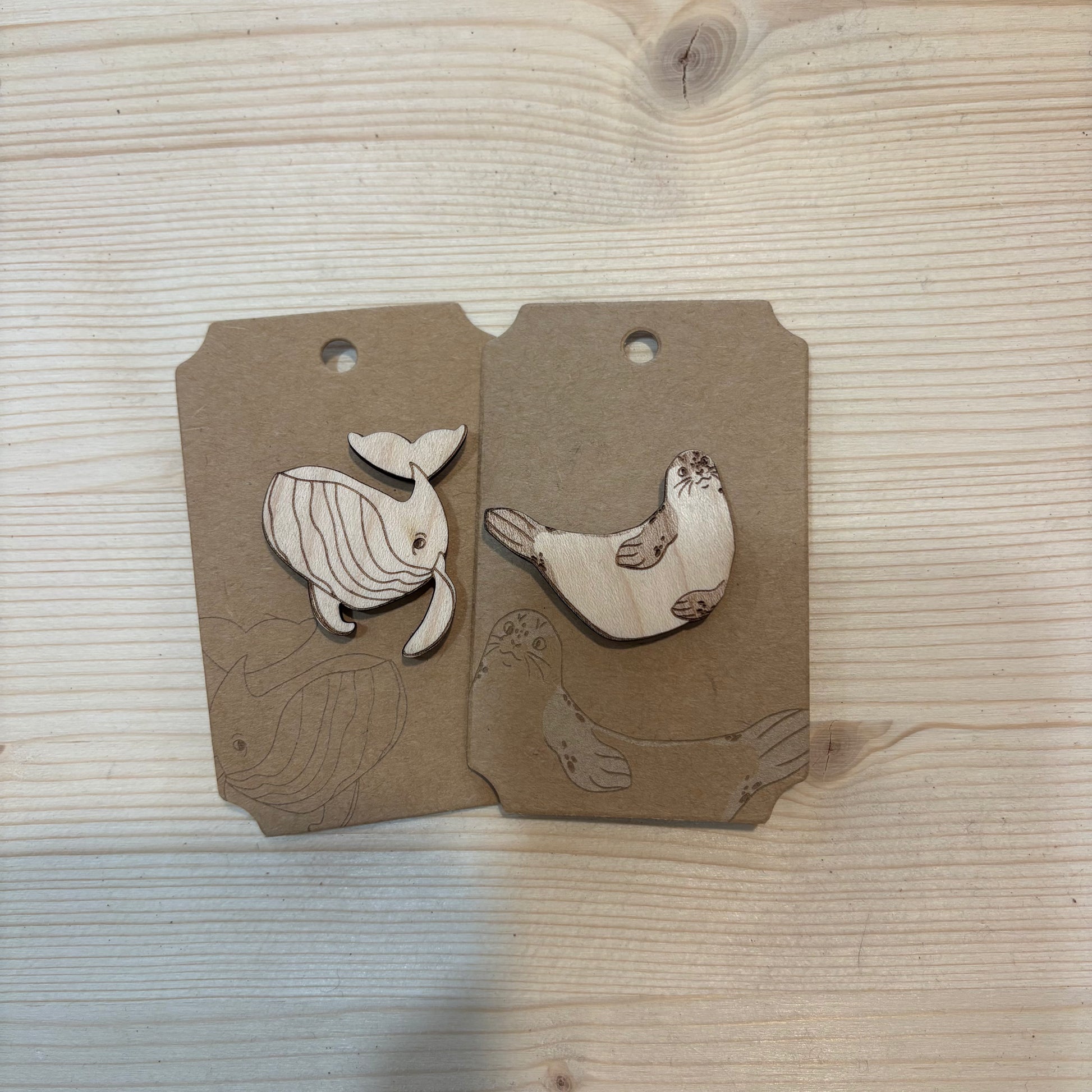 Petits pins en bois représentant des animaux, imaginés et fabriqués à la main. Légers et originaux, ils ajoutent une touche ludique et naturelle à vos tenues et accessoires.