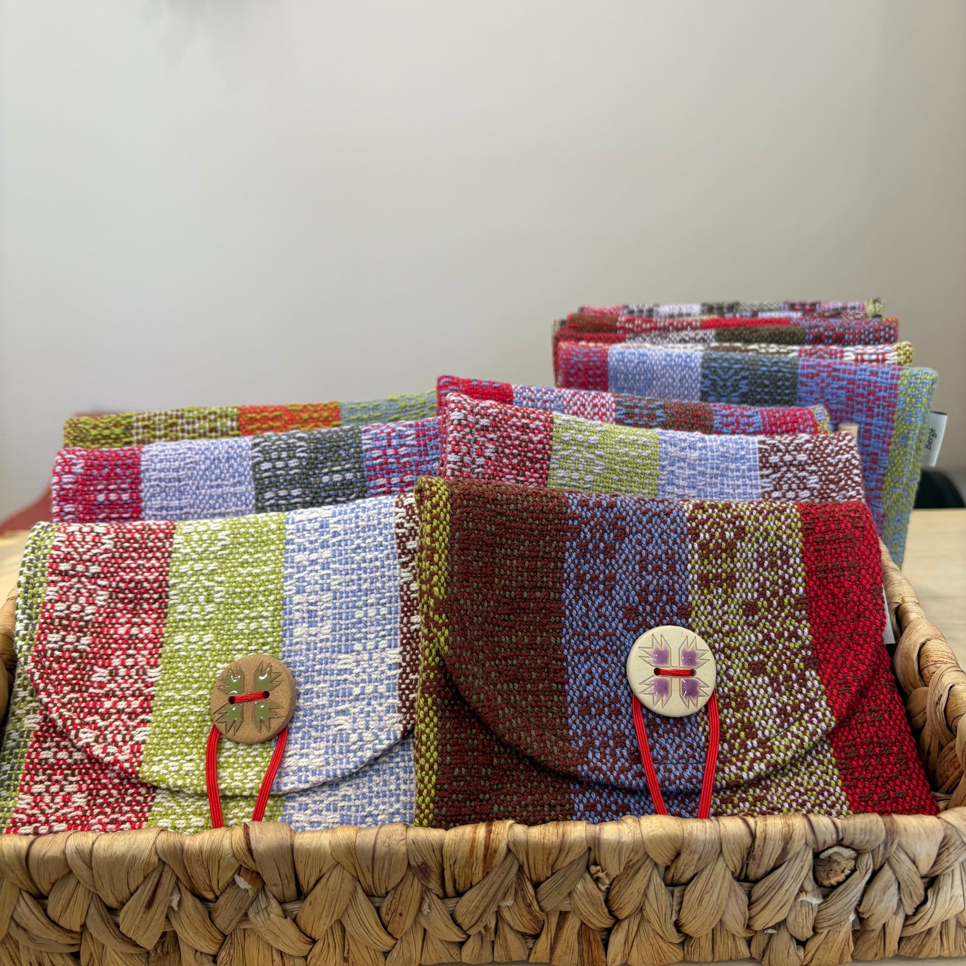 Chaque pochette est tissée en coton et entièrement doublée de tissus recyclés. Le bouton en céramique est façonné à la main, un à un, puis peint avec soin, pour une finition à la fois artistique et délicate.