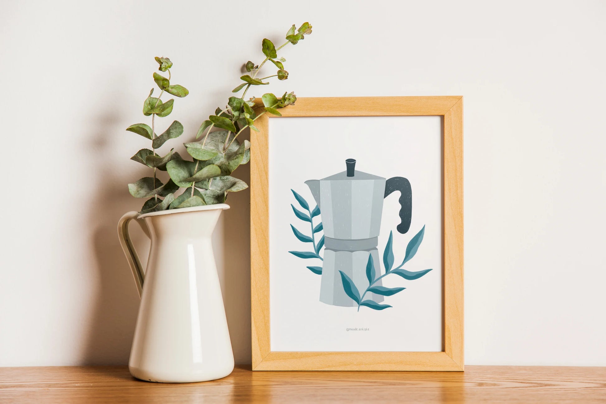 Cette illustration captivante met en scène une presse italienne, également connue sous le nom de cafetière à piston, entourée de plantes aux teintes bleues apaisantes. Avec ses détails fins et ses couleurs subtiles, cette œuvre allie l’élégance d’un objet quotidien à la beauté naturelle des plantes. Parfaite pour les amateurs de café, de design minimaliste et de nature, cette affiche apportera une touche créative à votre espace.