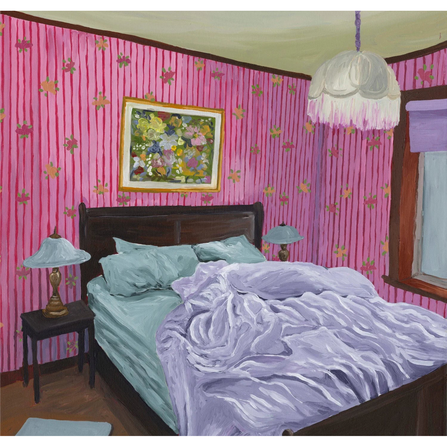 Après un matin tranquille à Berthier-sur-Mer, l’artiste découvre une photographie prise par son amie Béatrice : un lit défait, des draps blancs, une lampe fleurie, un papier peint rose à rayures. Une scène à la fois banale et profondément évocatrice, qu’elle choisit de peindre.