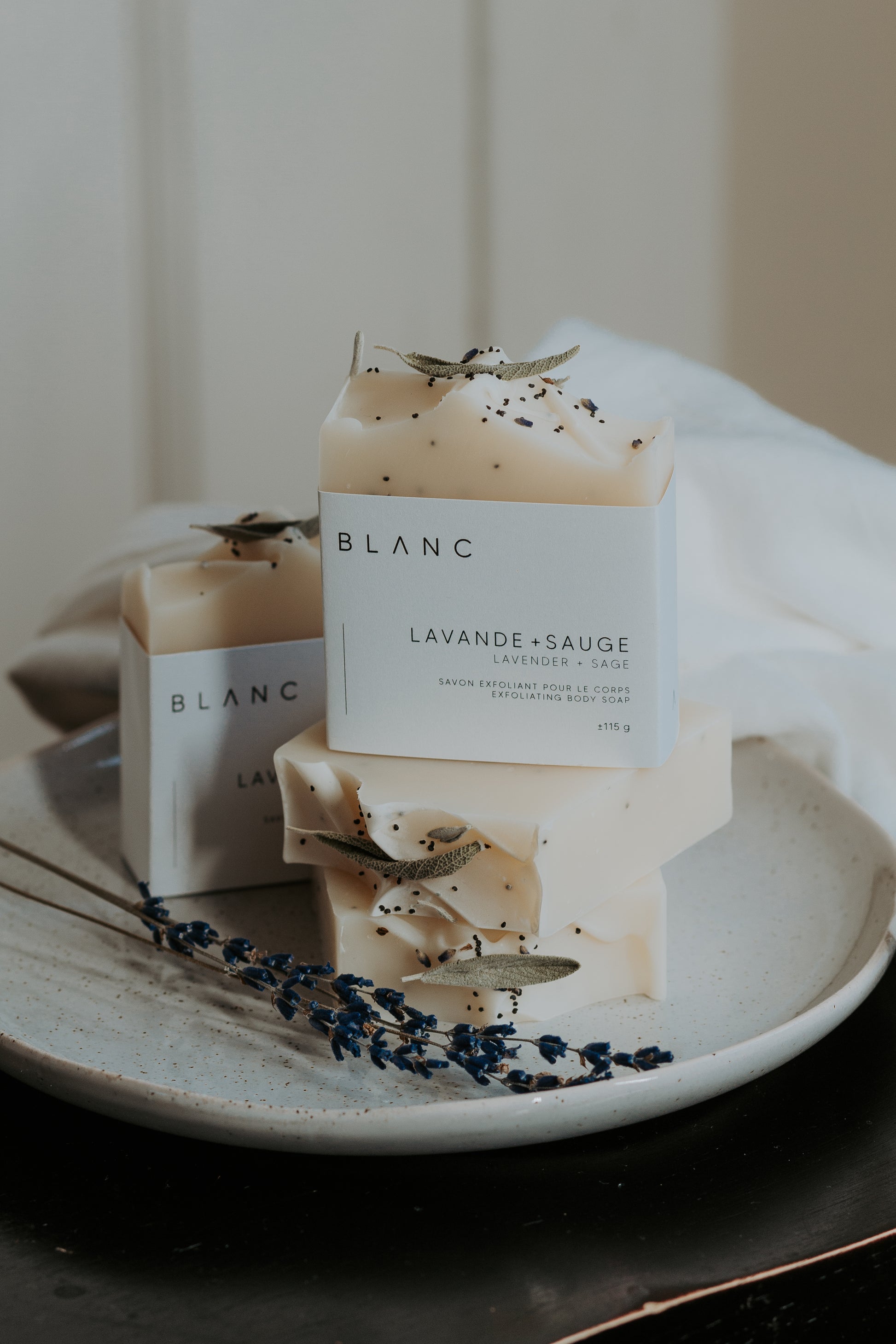 INGRÉDIENTS | Huiles et beurres saponifiés (olive, coco bio +équitable, tournesol bio du Québec, karité bio + équitable, ricin bio), huiles essentielles de lavande et de sauge officinales, graines de pavot, argile blanche. Bourgeons de lavande et feuilles de sauge issus de fermes florales locales et/ou de notre jardin urbain.